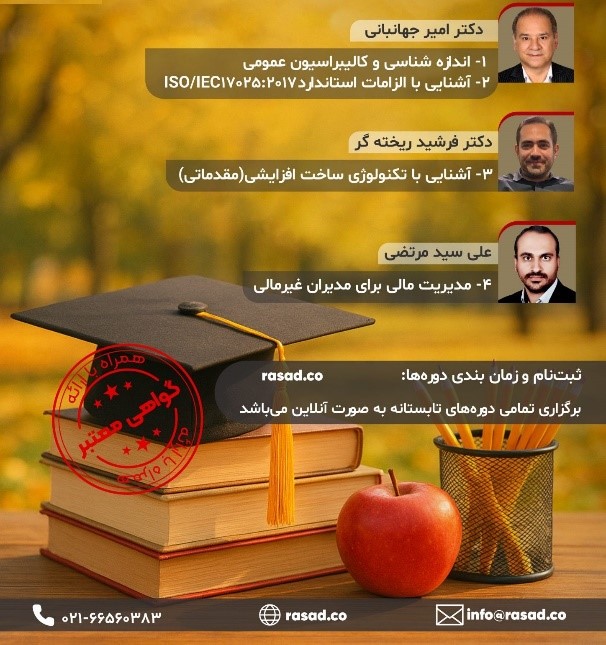 علاقمندان جهت کسب اطلاعات تکمیلی، مشاهده زمانبندی برگزاری دورهها و همچنین ثبت نام، به سایت rasad.co مراجعه نموده و با شماره 66560383-021 تماس بگیرند.